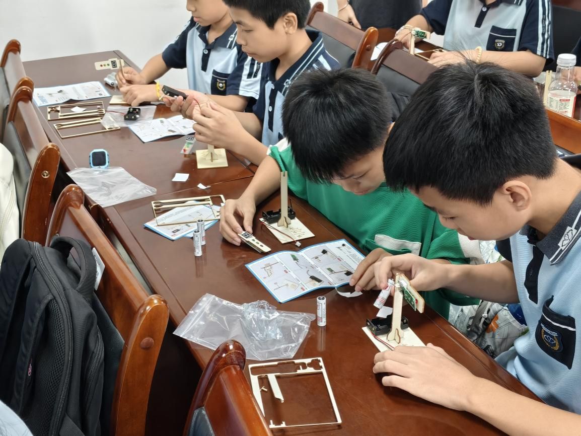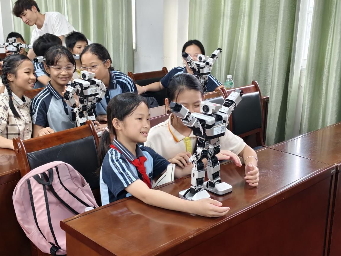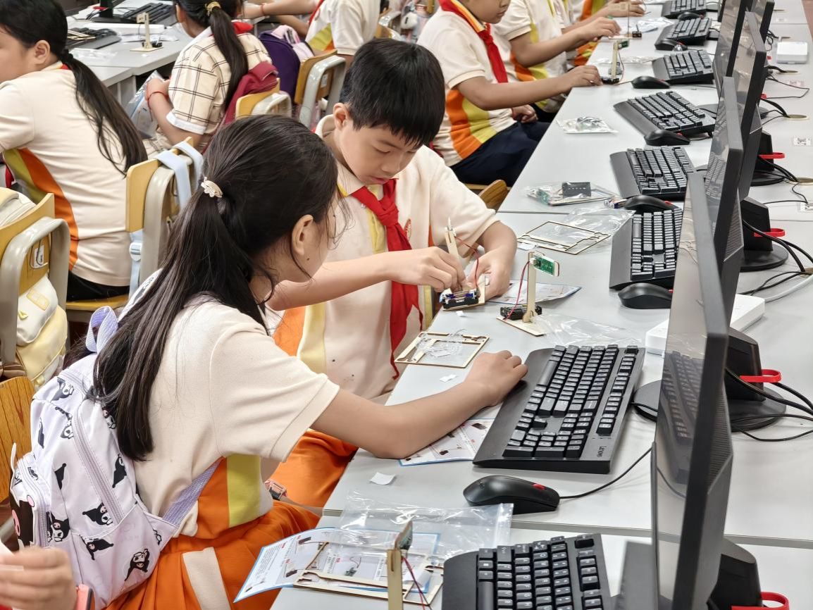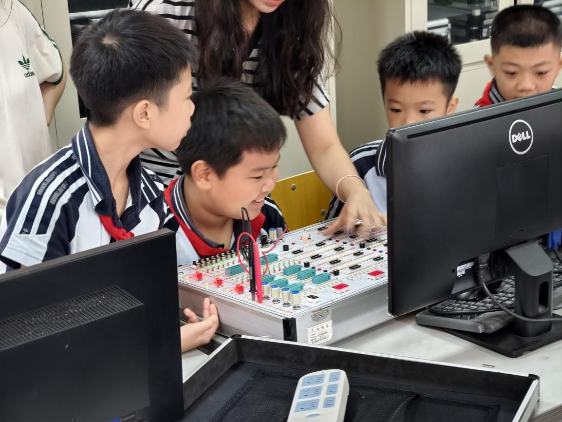 下午,五、六年级学生交换场地继续研学。在人工智能学院实验室,同学们近距离观看了机器人、机器狗的精彩表演,并在老师指导下亲手参与红绿灯模型制作与数字电路箱实验。大家在动手实践中感受科技的神奇与乐趣,逻辑思维与团队协作能力也得到了有效锻炼。