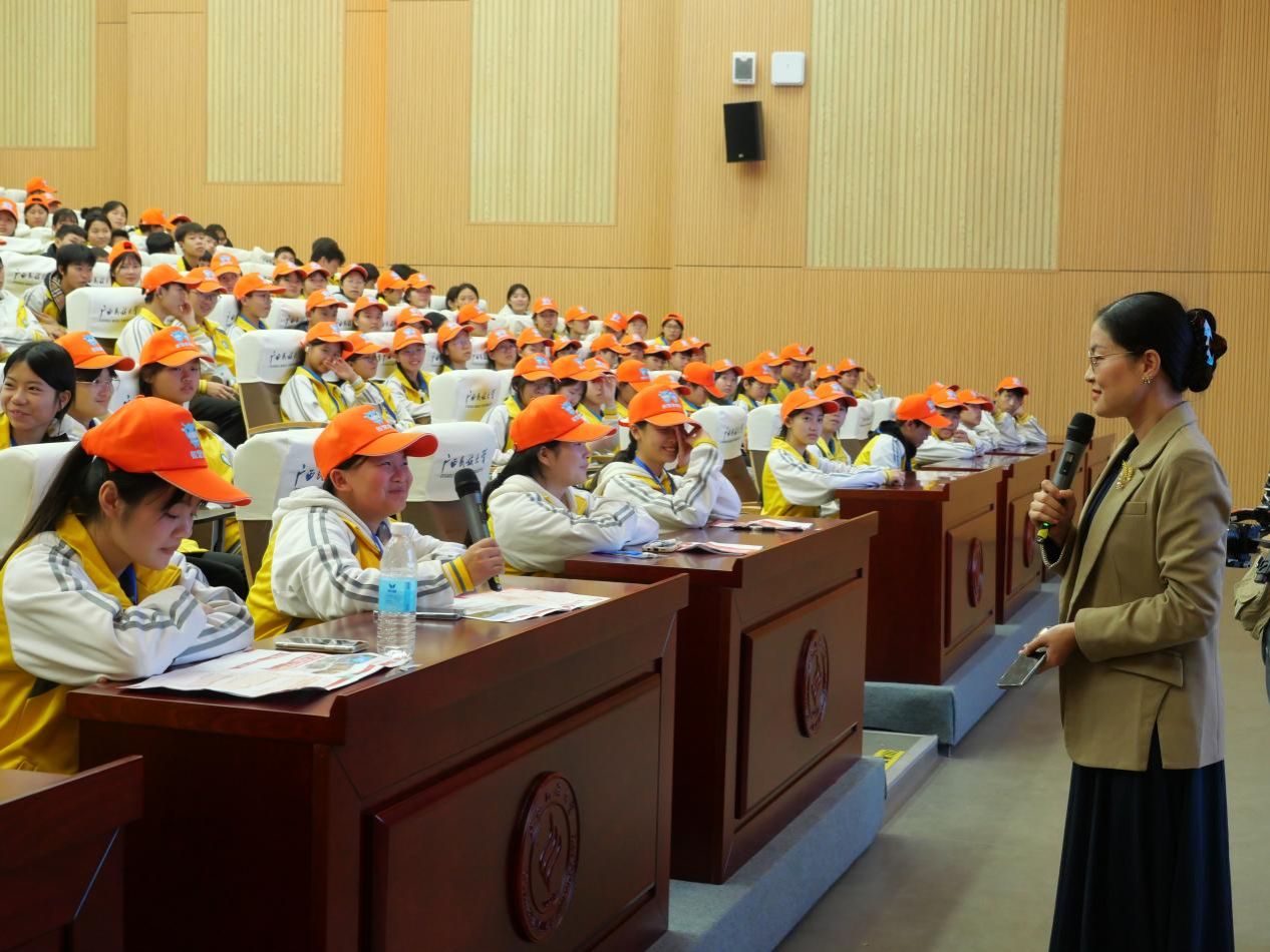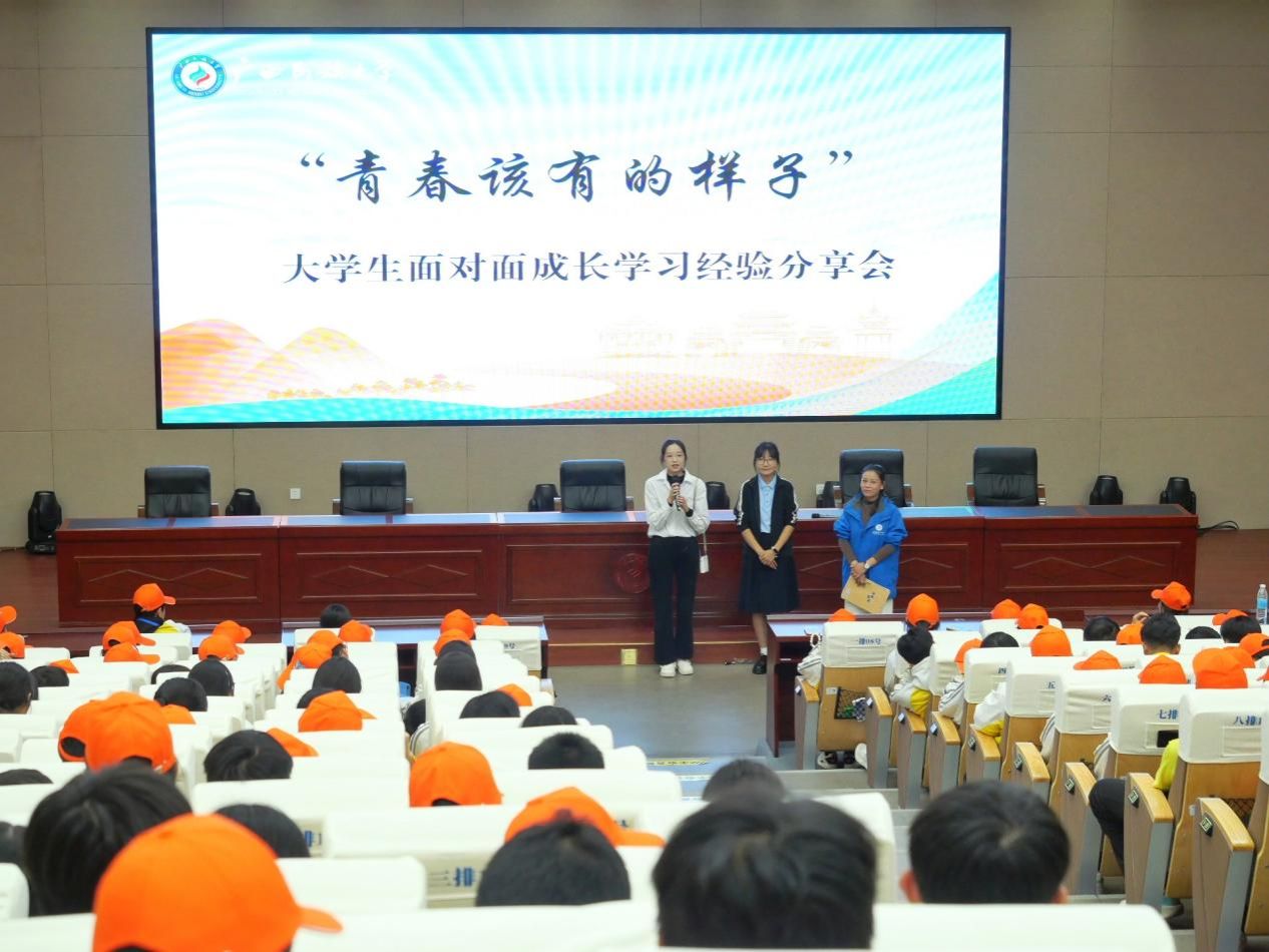 随后,师生们来到文化研习基地报告厅,聆听马克思主义学院周园老师带来的《学业规划与兴趣潜能探索》专题讲座。周老师以生动有趣的方式与同学们频频互动,现场气氛热烈,掌声不断。接着,两位优秀的大学生代表分享了他们的大学生活体验,为学弟学妹们答疑解惑,让初中生们对未来的大学生活有了更直观的认识。