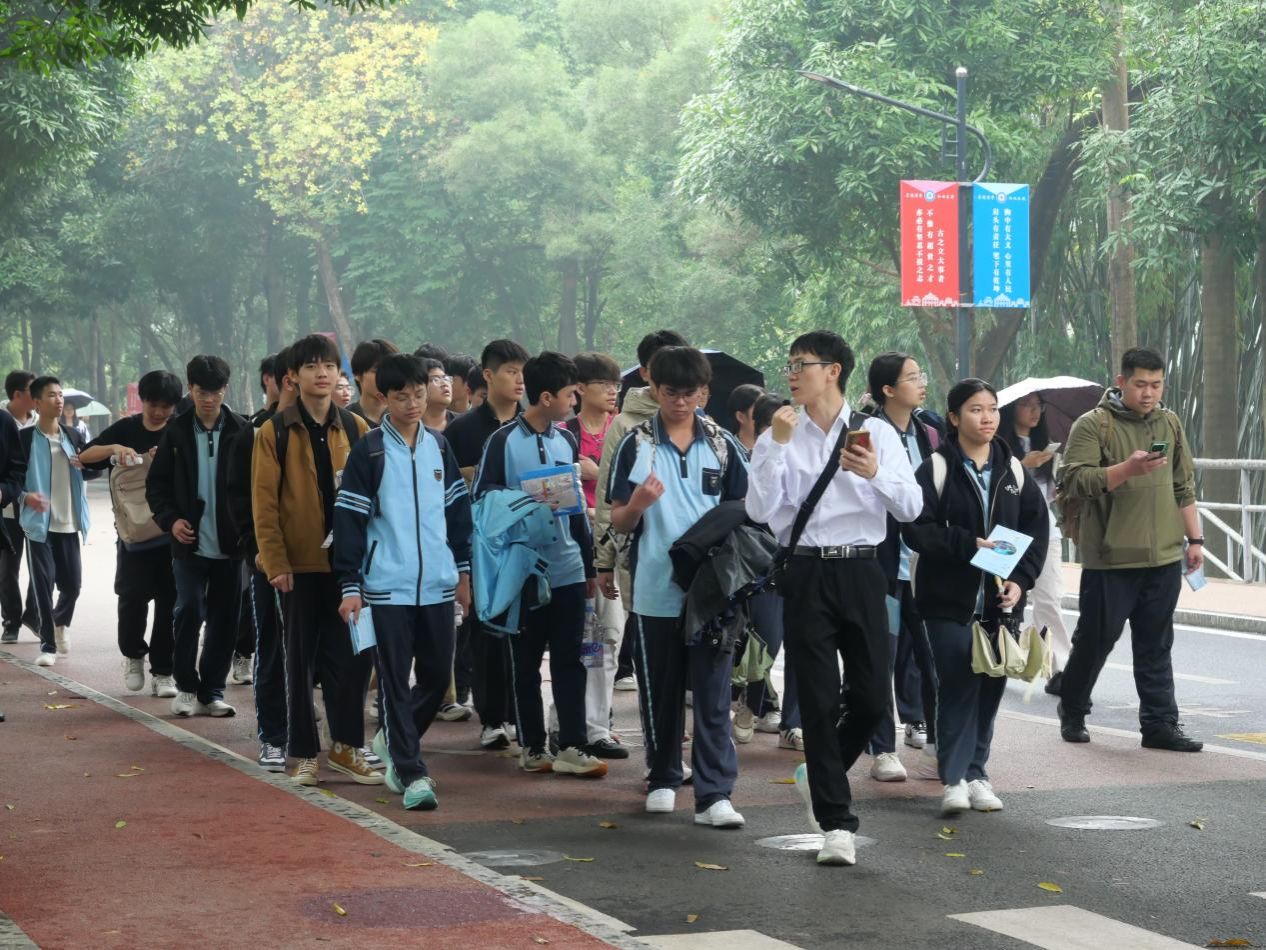 上午,同学们在讲解员的带领下,漫步于风景如画的相思湖畔。湖光潋滟,绿树成荫,校园中浓厚的学习氛围与人文气息深深吸引了同学们。虽然下着小雨,但同学们依然热情不减。他们边走边听,不仅感受了大学校园的独特魅力,也对大学生活有了更直观的憧憬。