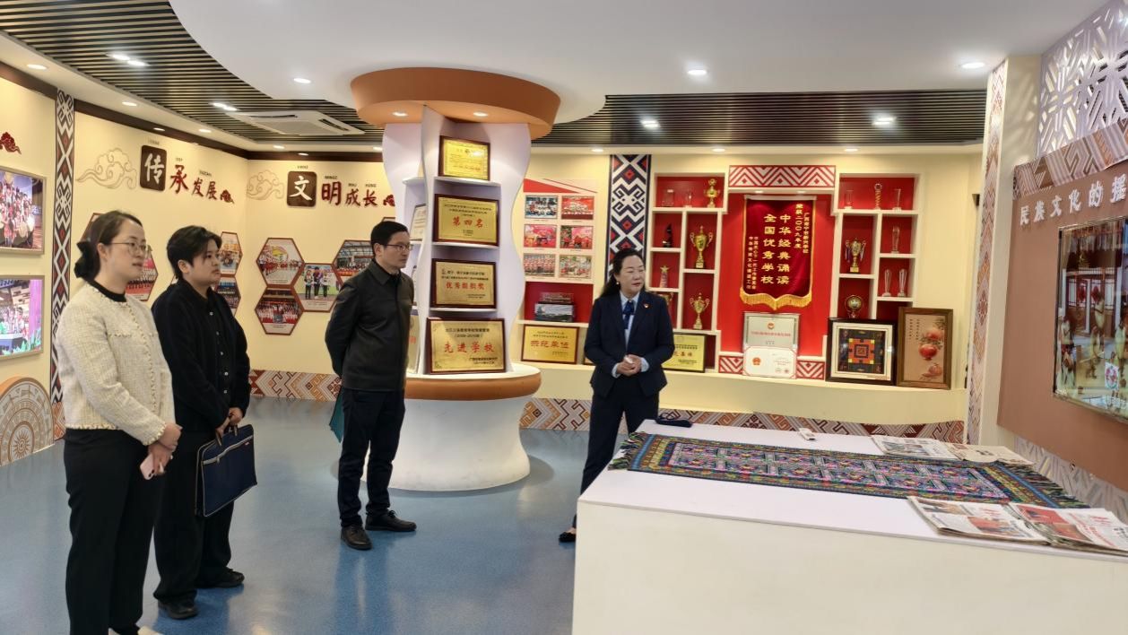调研组在南宁市新兴民族学校校长吴鸿丽陪同下,深入校园特色文化阵地,沉浸式感受“小细节,大教育”的办学理念,为调研组提供了基层民族文化教育的鲜活样本。
