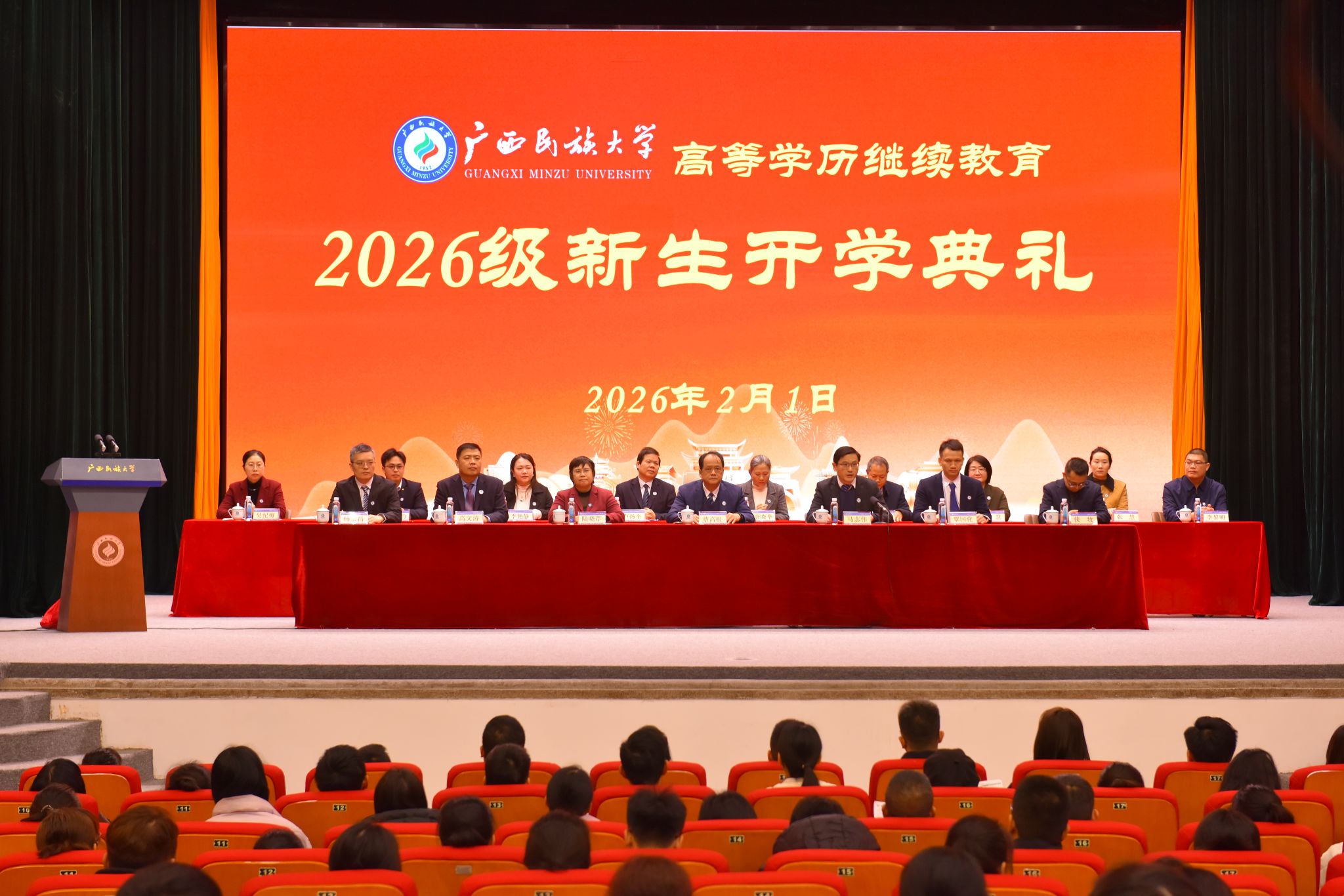 2026年2月1日上午,bw必威西汉姆联高等学历继续教育2026级新生开学典礼在相思湖校区大礼堂举行,学校党委常委、副校长蔡高根出席典礼并讲话,典礼由继续教育学院党委书记、院长马志伟主持。开学典礼采用“线上+线下”方式进行,来自全区各地200多名新同学在学校线下主会场参加典礼,其余新生同步观看线上直播。