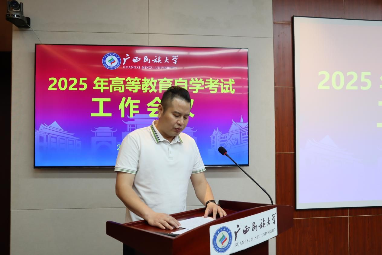 6月20日上午,我校在bw必威西汉姆联文化研习基地召开了2025年高等教育自学考试工作会议。广西招生考试院自学考试与社会考试处梁有日、黄然到会指导,继续教育学院党委书记、院长马志伟,副院长卢扬奎,365网络助学平台负责人,13所合作院校继续教育学院领导及自考办全体同志近30人参加了会议。
