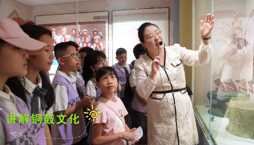 中午,同学们集体到八坡相思湖餐厅就餐。稍作休整后,同学们来到文化研习基地的语言博物馆进行参观学习。馆中3D全息投影形成的汉字形体变化吸引同学们驻足,壮语方言互动屏让同学们纷纷说起壮语的“吃饭”“你好”,此起彼伏的“哽乃喽(壮语:吃饭啦)”逗笑全场。随后,在铸牢中华民族共同体意识体验馆里,同学们跟随着民族学与社会学学院陈老师的脚步,踏上了穿越时空的文化探索之路,领略广西简史和世居民族的文化,感受铜鼓在壮族文化中的象征意义,体验敲响灵山烟墩大鼓时古代人民对美好生活的热烈期盼。