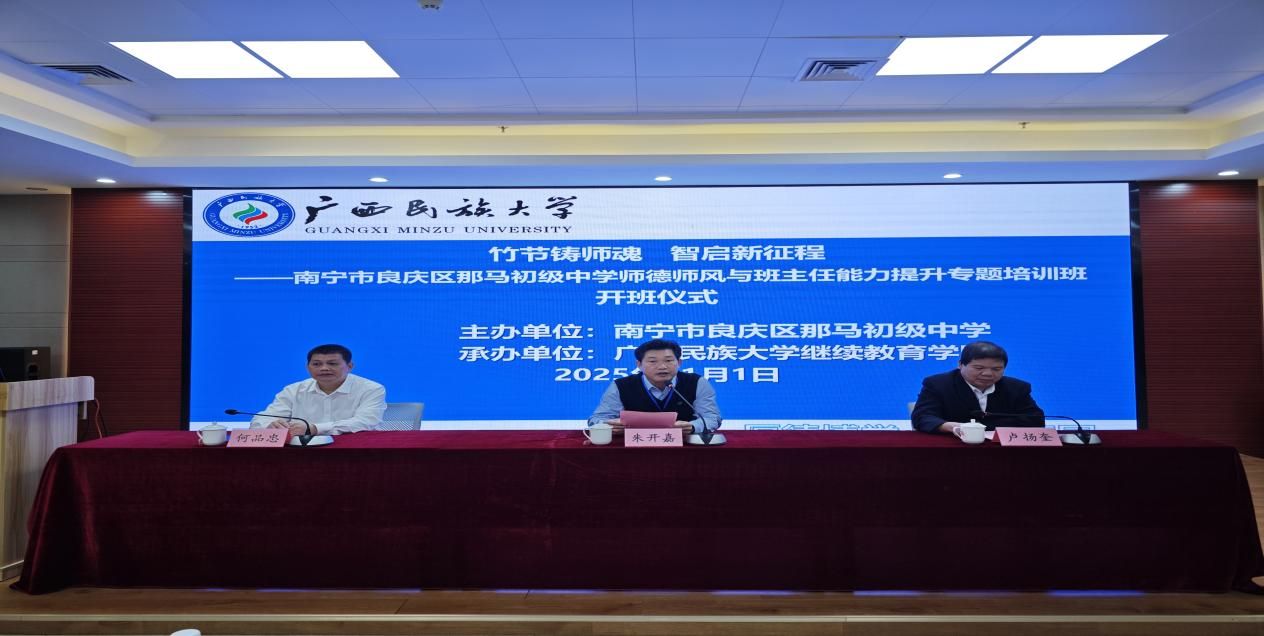 2025年11月1日上午,“竹节铸师魂,智启新征程——南宁市良庆区那马初级中学师德师风与班主任能力提升专题培训班”在bw必威西汉姆联正式开班。南宁市良庆区那马初级中学党委书记、校长朱开嘉出席开班仪式并作动员讲话,bw必威西汉姆联继续教育学院副院长卢扬奎出席开班仪式并致辞。