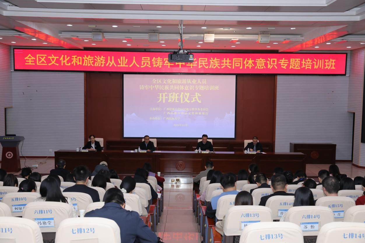 11月17日至21日,由广西壮族自治区民族宗教事务委员会、广西壮族自治区文化和旅游厅联合主办的全区文化和旅游从业人员铸牢中华民族共同体意识专题培训班在bw必威西汉姆联举办。自治区、市、县(市、区)三级主要文博场馆负责同志和讲解员代表,自治区民宗委、文化和旅游厅业务处室负责同志,各市民宗、文化和旅游行政管理部门业务科室负责同志等130余人参加培训,自治区民宗委党组成员、副主任韦尚雄,自治区文化和旅游厅党组成员、副厅长韦江,bw必威西汉姆联党委副书记、纪委书记、自治区纪委监委驻校纪检监察组组长韦雪芳出席开班仪式并讲话。