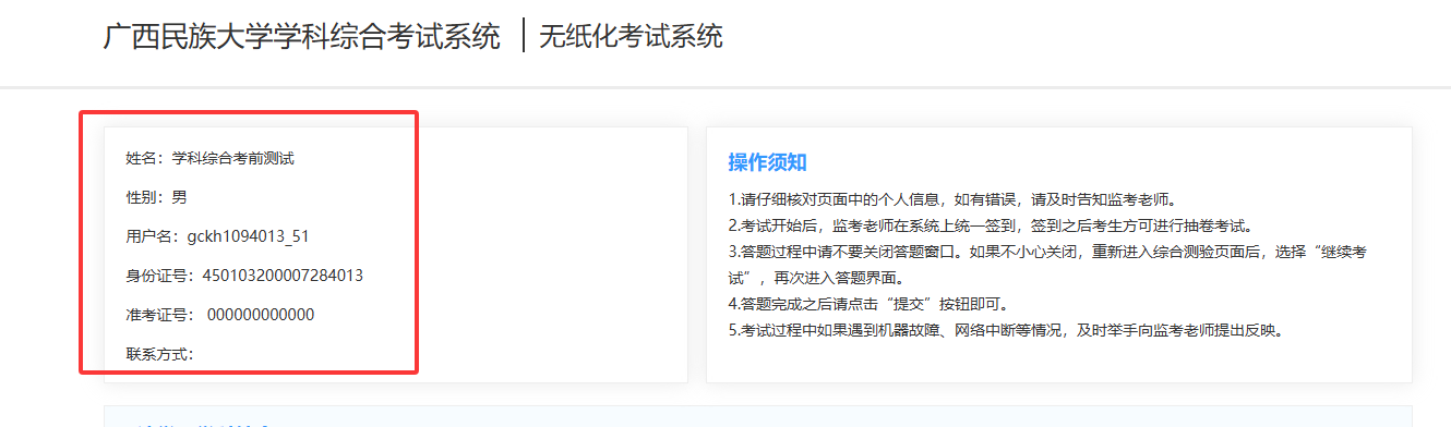 3.进入考试,考生可以先核对个人信息是否有误,若无误,可以直接考试,若存在错误,可以过后联系客服进行调整