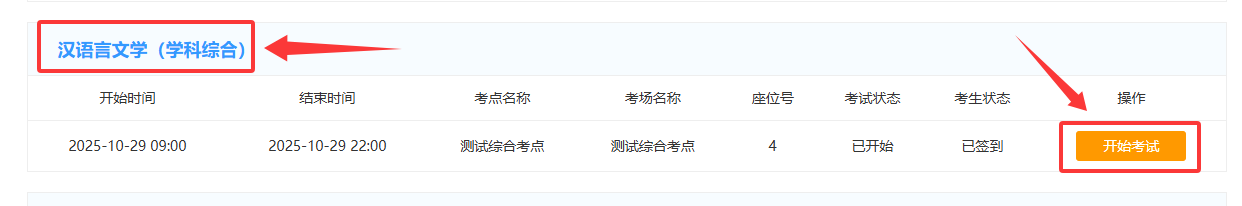 4.核实所考学科综合考试的专业,是否与自己的专业相符,然后点击“开始考试”