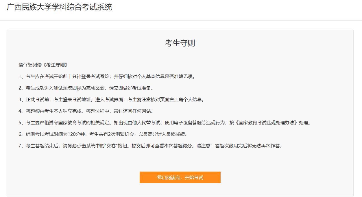 2.考生阅读完“考生守则”,点击“我已阅读完,开始考试”